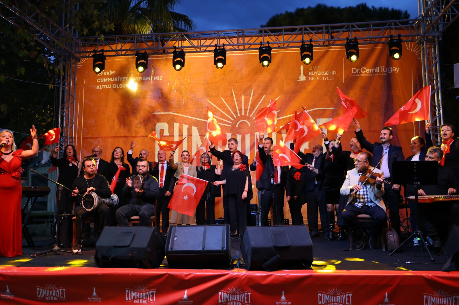 İzmir Büyükşehir Belediye Başkanı Cemil Tugay ise Cumhuriyet Bayramı’nı İzmir’in dört bir yanında coşkuyla kutlamaktan büyük mutluluk duyduklarını belirtti. İzmir’in hem Türkiye’nin kurtuluşunun hem de Cumhuriyetin kuruluşunun kenti olduğunu vurgulayan Başkan Tugay; “İzmirlilerin babaları, dedeleri bu topraklarda düşmanla yiğitçe savaşmışlardır. Bu nedenle İzmirli olmakla gurur duyarız. Atatürk, milletinin onuru için demokrasiyi armağan etti ve herkesi eşit vatandaş olarak kabul etti. O yüzden Cumhuriyet kimsesizlerin kimsesidir. Bizlere düşen görev, devraldığımız bu büyük mirası korumak ve bizden sonraki nesillere daha güçlü bir şekilde teslim etmektir” dedi.