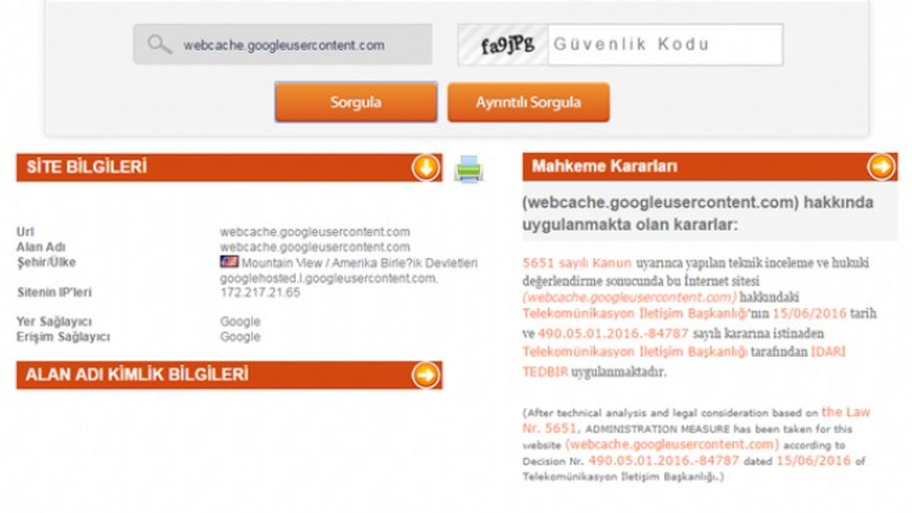 '5651 sayılı Kanun uyarınca yapılan teknik inceleme ve hukuki değerlendirme sonucunda bu İnternet sitesi (webcache.googleusercontent.com) hakkındaki Telekomünikasyon İletişim Başkanlığı'nın 15/06/2016 tarih ve 490.05.01.2016.-84787 sayılı kararına istinaden Telekomünikasyon İletişim Başkanlığı tarafından İDARİ TEDBİR uygulanmaktadır.'