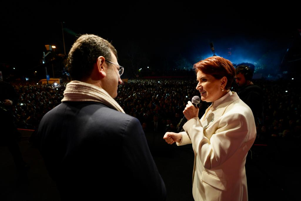 Akşener, konuşmasının son bölümünde ise İmamoğlu'nun elini tuttu ve 'Hiçbir haksızlık sonsuza kadar sürmez. Hele aziz milletimizde hiç sürmez. Geldikleri gibi giderler, geldikleri gibi gittiler. Geldikleri gibi sizin iradenizle gidecekler. Allah'a emanet olun. Tekrar söylüyorum; demokrasi bizimdir, sandık bizimdir ve bu irade elbette ki bizimdir' diyerek sözlerini tamamladı.