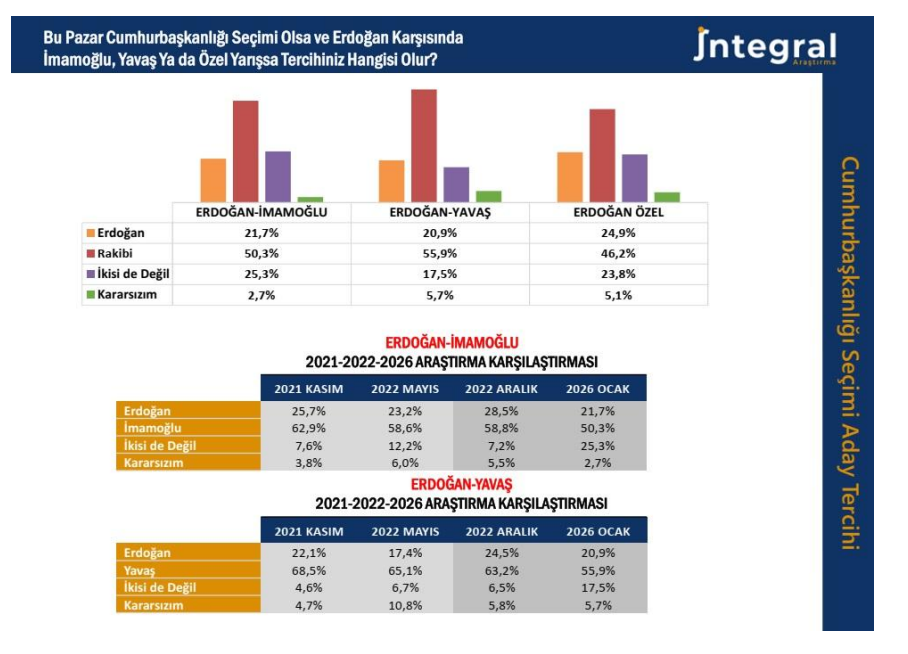 İntegral Araştırma son 4 yıl boyunca yaptığı araştırmalarla karşılaştırıldığında Erdoğan ile CHP’nin olası adayları senaryoları için en kritik bulgunun “İkisi de değil, Kararsızım” seçeneklerindeki artış olduğunu açıkladı. Bu artışın hem iktidar hem muhalefet cephesindeki yorgunluk kadar seçmenin yeni yol, yeni aday arayışı ve de özellikle İstanbul merkezli yürütülen soruşturmalarla açıklanabileceği vurgulandı.