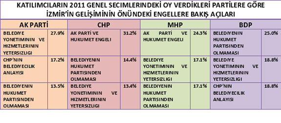 AK Parti'ye oy verenlerin yüzde 45'i İzmir'in önündeki engelin 'CHP'li Belediyeler' olduğu görüşünde. İzmir'in belediyelerinin hükümetten olmaması da AK Partililer için yüzde 13,5 ile İzmir'in önündeki önemli bir engel. CHP'ye oy verenler de kentin önündeki engelin hükümet ve AK Parti olduğu görüşünde. Bu yanıtı işaretleyenlerin oranı yüzde 45'te kalırken, CHP'liler kendi belediyelerini de yüzde 13,4 oranında kentin önünde engel olarak görüyor. MHP'ye oy verdiğini ifade eden katılımcıların yüzde 41,4'ü hükümeti engel olarak görürken, yüzde 25,7'si belediyeyi, BDP'ye oy verdiğini ifade eden katılımcıların yüzde 25'i hükümeti engel olarak görürken, yüzde 37,7'si belediye yönetimini ve CHP'yi engel olarak görüyor.