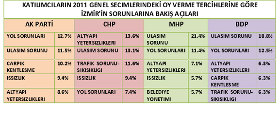 Altyapı eksiklikleri ve ulaşım ve trafik sorunu yüzde yüzde 40'a yakın yanıtla ilk üçte yer aldı. MHP ve BDP seçmeni için de sorun sıralaması değişmedi. Altyapı, ulaşım, trafik, işsizlik sıralaması bozulmadı.
