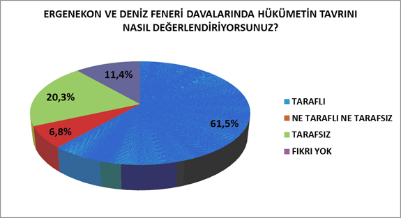 Ülkenin gündeminde oldukça yoğun bir biçimde yer alan 'Ergenekon ve Deniz Feneri davalarında hükümetin tavrını da sorgulayan İntegral, 'hükümet bu iki davada taraf mı' sorusunda katılımcıların yüzde 61,5'inden 'evet' yanıtını aldı. Hükümeti tarafsız bulanların oranı yüzde 20,3'te kalırken AK Partililerin de hükümeti 'taraf' bulması dikkat çekti. Hükümeti iki kritik davada taraf gören İzmirli AK Partililerin bir bölümünün iktidarın taraflılığını doğru bulması da dikkat çekici sonuçlardan biriydi.