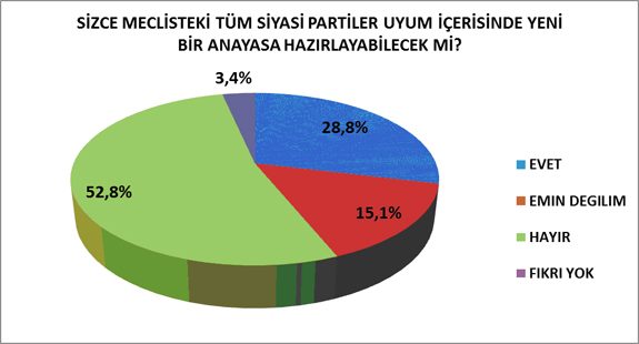 İntegral'in kapsamlı İzmir anketinde yöneltilen sorulardan biri de Yeni Anayasa hazırlıklarına dairdi. İzmirlilere bu meclisin yeni anayasa yapacağına inanıyor musunuz? Diye soran İntegral, katılımcıların yüzde yarısının 'hayır, inanmıyoruz' yanıtıyla karşılaştı. Yüzde 28'in 'evet' dediği araştırmada 'belki' yanıtı üçüncü sırada kaldı. Türkiye'nin önemli ve güncel sorunlarından 'terör meselesini' de sorgulayan İntegral, 'terör sorununu bu hükümet çözebilir mi?' sorusunda katılımcıların yüzde 70'inden 'hayır, çözemez' yanıtı aldı. AK Partililerin de önemli bölümünün hükümetin terör sorununu çözeceğine inanmıyor oluşu dikkat çekti. Van'daki felaketle birlikte yeniden gündemin birinci maddesi olan deprem algısını da ölçmeye çalışan İntegral, 'oturduğunuz evin depreme dayanıklı olduğunu düşünüyor musunuz?' sorusunda İzmirlilerin yüzde 42'sinin 'inanıyorum' yüzde 37'sinin 'inanmıyorum' kalanların da 'emin değilim' yanıtı vermesi dikkat çekti.
