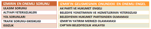Gelen yanıtlara göre seçenekleri oluşturan İntegral, yüzde 22,5 ile ilk sırada yer alan 'AK Parti ve Hükümet' seçeneği için İzmirlilerden 'Hükümet para vermiyor. Yatırımları engelliyor. İzmir'e üvey evlat muamelesi yapılıyor. CHP'nin kalesi olduğu için İzmir'i cezalandırıyor' gibi yanıtlar aldı. İzmir'in gelişiminin önünde CHP'li yerel yönetimleri gören yüzde 20,4'lük kesim de 'Belediyeler çalışmıyor. Yerel yönetimler beceriksiz. Başkan İzmir'i yönetemiyor. İzmir'i yönetecek ekip kuramadılar. İşler çok yavaş ilerliyor. Başkanlar birbirleriyle uyumlu değil' gibi yanıtlar verdi.