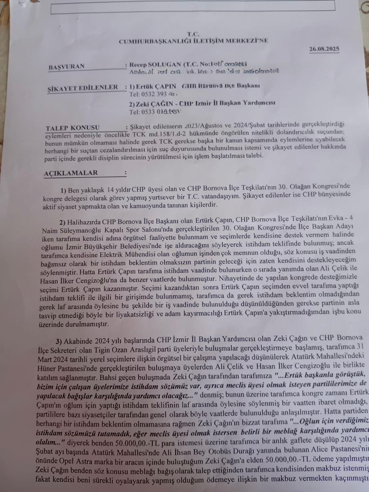Berivan KAYA/EGEDESONSÖZ- CHP Bornova 30. Olağan Kongresi’nde delege olan Recep Solugan’ın, CHP Bornova İlçe Başkanı Ertürk Çapın ve CHP İzmir İl Başkan Yardımcısı Zeki Çağın hakkında Cumhurbaşkanlığı İletişim Merkezi’ne şikayette bulunduğu öğrenildi.