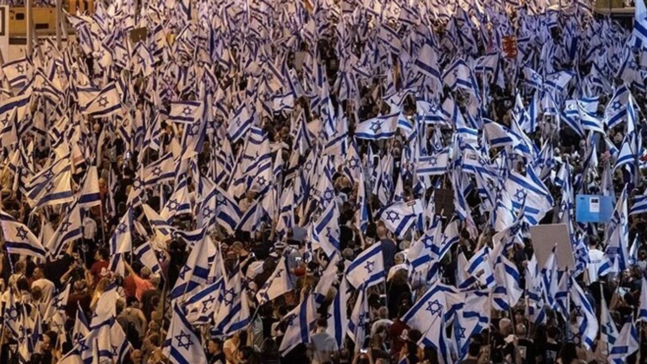 Netanyahu öncülüğündeki aşırı sağcı koalisyon hükümetinin yargı düzenlemesine karşı her hafta cumartesi akşamı kitlesel gösteriler düzenleyen İsrailliler, protestoların 21'inci haftasında ülke genelinde yine meydanlara indi.
