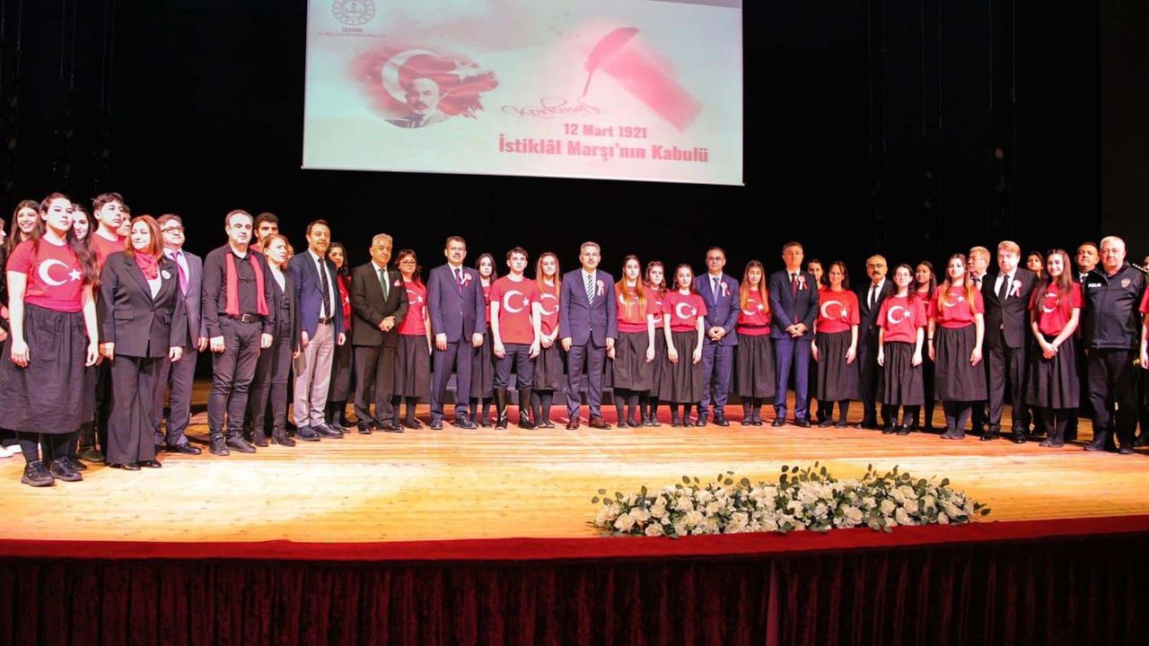 İzmir İl Millî Eğitim Müdürlüğü tarafından Dokuz Eylül Üniversitesi Sabancı Kültür Merkezi’nde düzenlenen törene Süleyman Elban, Ömer Yahşi, il protokolü, eğitim yöneticileri, öğretmenler ve öğrenciler katıldı. Program, saygı duruşunun ardından Işılay Saygın Güzel Sanatlar Lisesi Orkestrası eşliğinde İstiklâl Marşı’nın okunmasıyla başladı. Programda, Mehmet Âkif Ersoy’un hayatı ve Türk milletinin bağımsızlık mücadelesine ilişkin sinevizyon gösterimi de izletildi. İzmir Milletvekili Tamer Osmanağaoğlu’nun günün anlam ve önemine ilişkin telgrafı okundu.