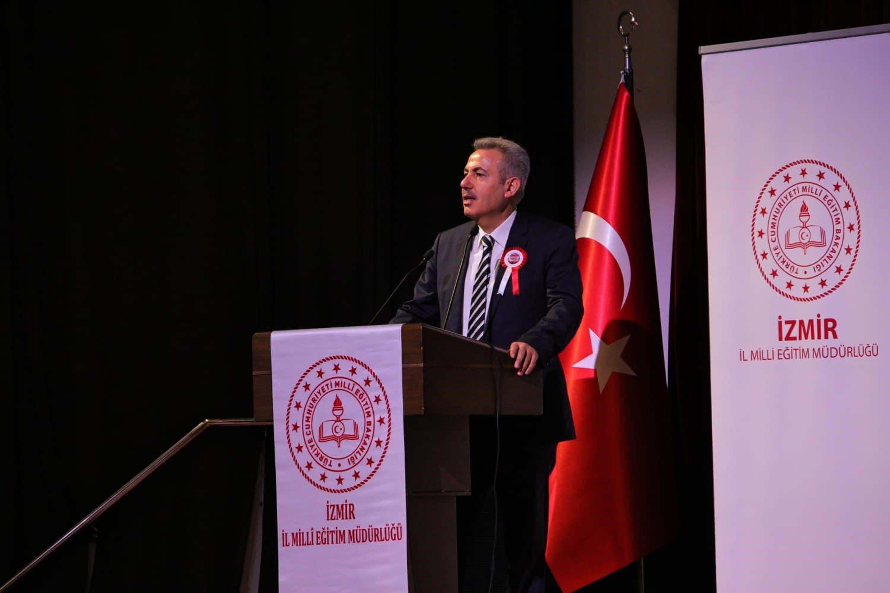 Programda açılış konuşmasını yapan İzmir İl Millî Eğitim Müdürü Dr. Ömer Yahşi, İstiklâl Marşı'nın yalnızca bir şiir değil, milletin inancını, karakterini ve bağımsızlık iradesini yansıtan büyük bir destan olduğunu vurguladı. Yahşi, "Toprakları işgal altında, umutları sınanmış ama inancı, cesareti ve vatan sevgisi asla sönmemiş bir millet düşünün. İşte o günlerde bir kalem, milletin kalbindeki ateşi kelimelere döktü. O kalem Mehmet Akif Ersoy'un kalemiydi. İstiklâl Marşı'nın yazıldığı Tacettin Dergâhı'ndaki mütevazı oda Çanakkale'nin, Sakarya'nın ve Dumlupınar'ın ruhunu taşıyor. Sevgili öğrenciler, bu topraklar bize kolay vatan olmadı. Her karışının altında gençliğini, hayallerini ve canını bizler için feda etmiş ecdadın hatırası vardır. Şühedanın tertemiz kanlarıyla sulanmış bu topraklar bize ebedî vatan olarak emanet edilmiştir. Bizlere düşen görev, ecdadımızın emanet ettiği bu ruhu yaşatmak ve ay yıldızlı bayrağımızı geleceğe gururla taşımaktır" dedi.
