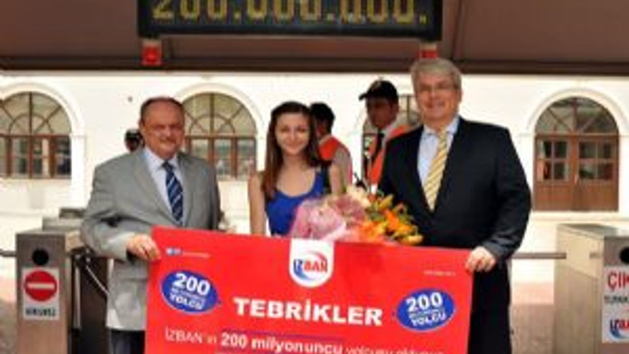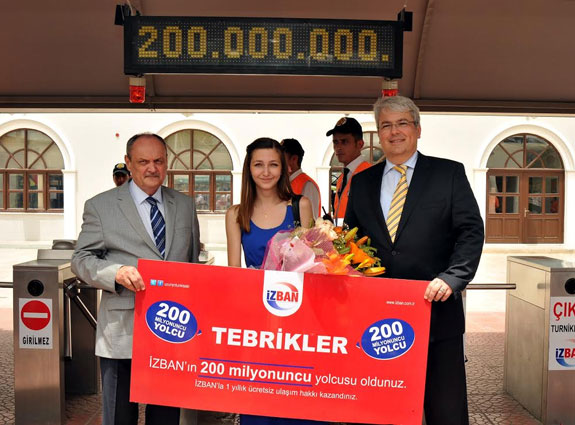 Yetersiz bakiye uyarısı üzerine geri dönüp yüklematikten kartını dolduran Elif Özçiçek, ikinci kez turnikenin başına geldi. Kartını okuttuğu anda çalan sirenler ve yağan konfetiler genç öğrenciyi heyecanlandırdı. İZBAN Genel Müdürü Sabahattin Eriş ve Genel Müdür Yardımcısı Sönmez Alev, Elif'in yanına giderek, 'İZBAN'ın 200 milyonuncu yolcusu olduğu' bilgisini verdiler. 21 yaşındaki üniversite öğrencisine bir buket çiçek armağan eden Eriş ve Alev, Elif Özçiçek'in İZBAN ile 1 yıl ücretsiz seyahat imkanı kazandığını da açıkladılar.