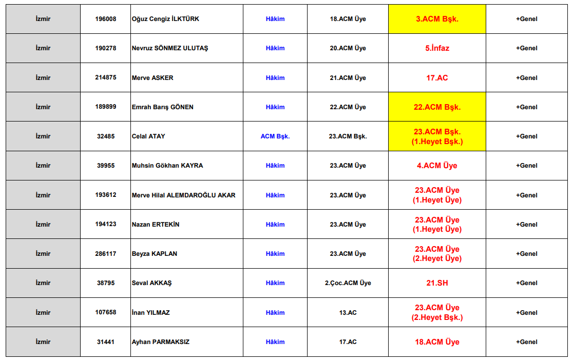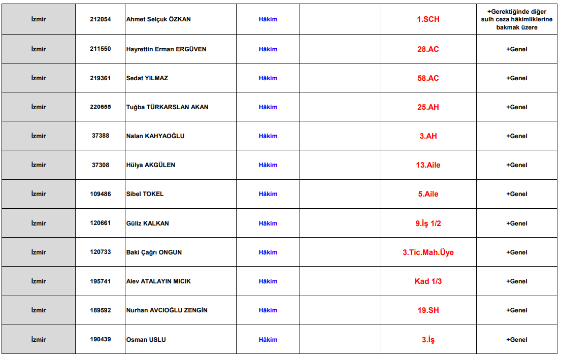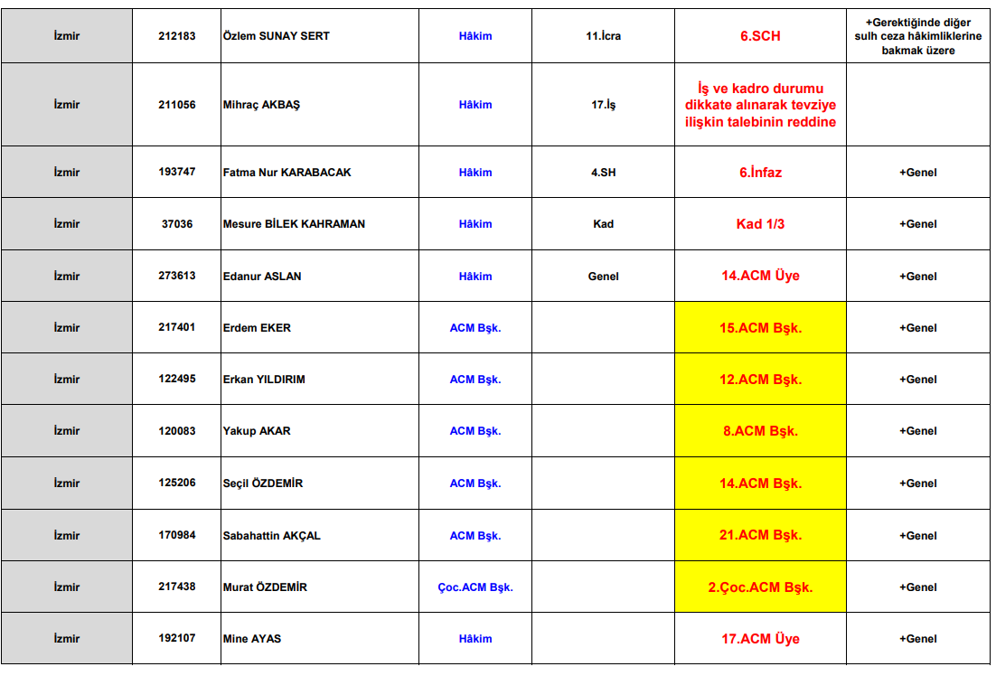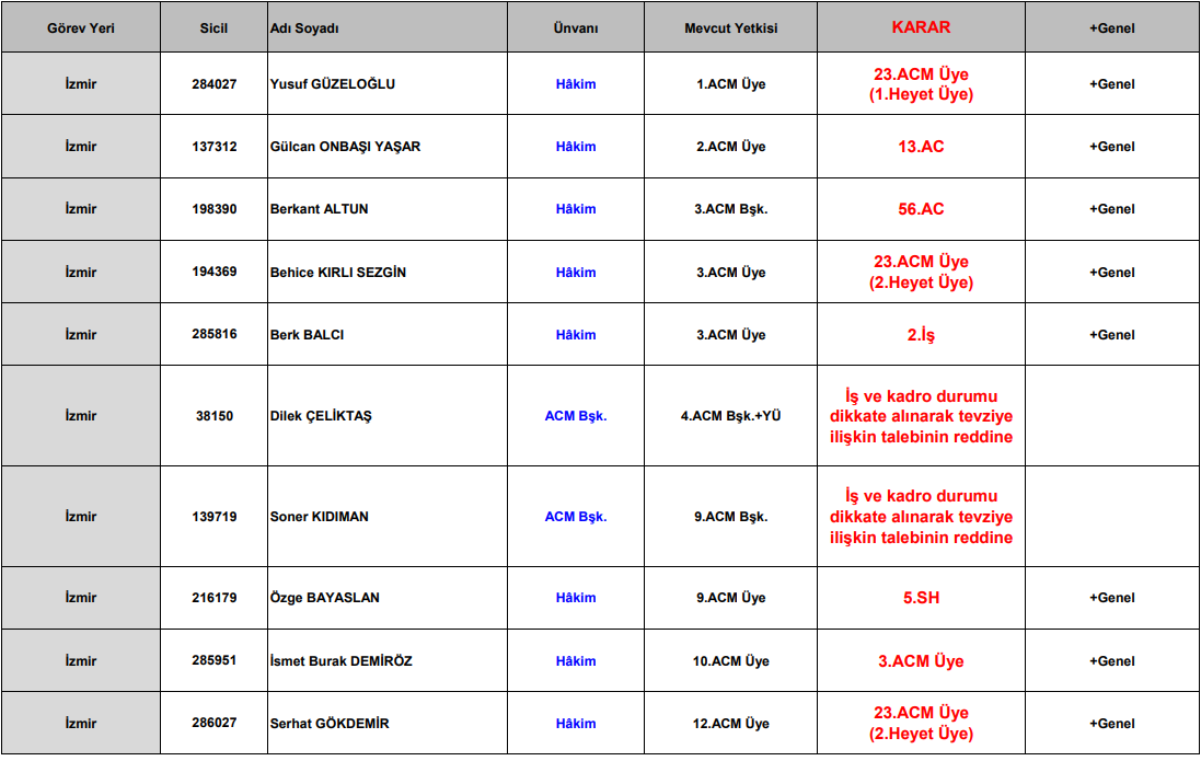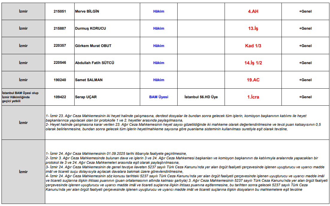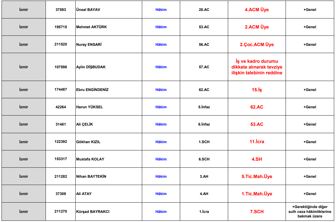 Kararla birlikte İzmir’de görev yapan çok sayıda hâkimin yetki alanlarında da değişiklik yapıldı. Bazı hâkimlerin tevzi talepleri iş ve kadro durumu gerekçesiyle reddedilirken, yeni görev yerleri ve mahkeme üyelikleri belirlendi.