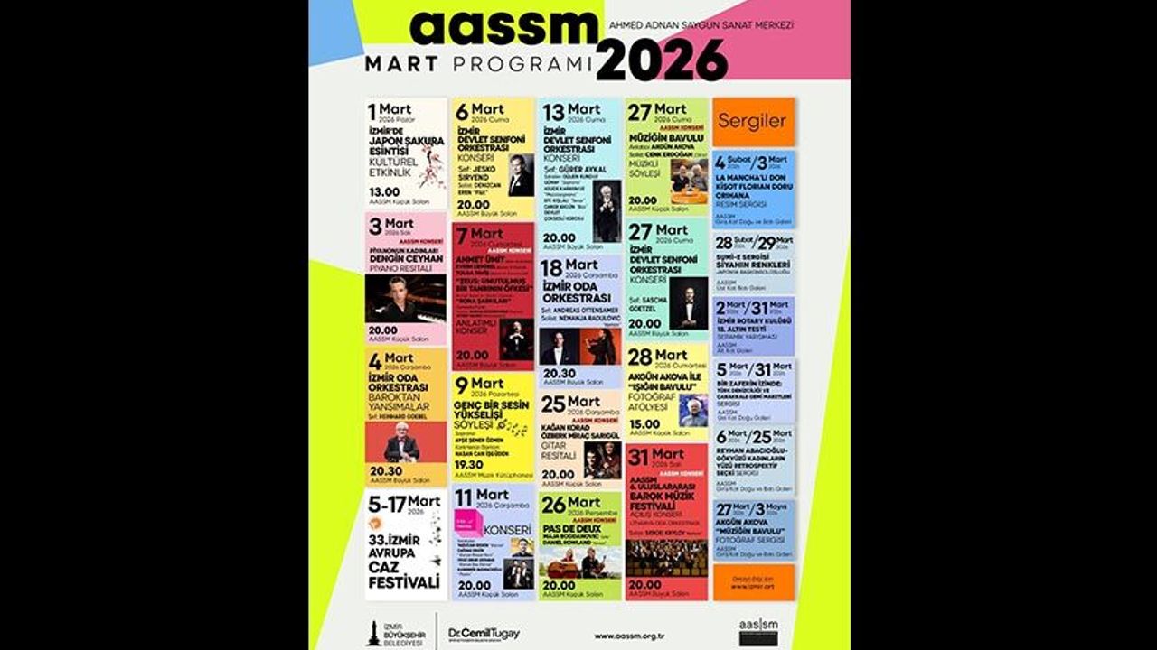 İzmir Büyükşehir Belediyesi Ahmed Adnan Saygun Sanat Merkezi’nin mart ayı programı sanat dolu. Konserlerden sergilere uzanan kapsamlı program, İzmir’in kültür-sanat vizyonunu güçlendirmeye devam ediyor.