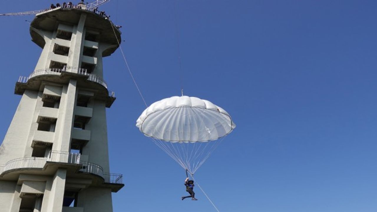 Etkinliğe katılanlar, pembe küçük kağıt uçaklar yaptıktan sonra THK personeli gözetiminde paraşütle kuleden atlayış yaptı.(AA)