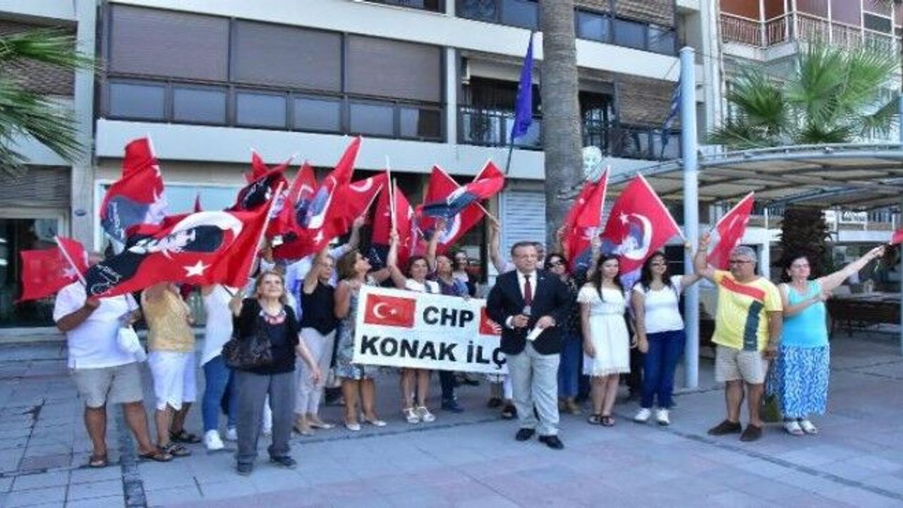 Basın açıklamasını okuyan CHP Konak İlçe Başkanı Mehmet Şakir Başak, 'Ulu önderimiz Mustafa Kemal Atatürk'ün dediği gibi 'Yurtta barış dünyada barış' gerekmektedir. Bunu geçici hevesler ve kişisel hırslar uğruna bozmaya kimsenin hakkı yoktur. Bir sözümüzde bizim Cumhurbaşkanımız ve hükümetimizin bu konudaki tavrınadır. Bazı devletlerle gereksiz birçok konuda gerginlikler çıkararak iç politika malzemesi olarak kullanan AKP söz konusu Ege Adaları olunca neden sessiz kalmaktadır? Yoksa adalar konusunda gizli ödünler mi verilmiştir? Bu konuda bir an önce Yunan hükümetine gerekli yaptırımlar uygulanmalı ve uluslararası haklarımız hatırlatılmalıdır. İki ülke arasındaki hukuksuzluğun bir an önce ortadan kaldırılmasını ve çözüme kavuşturulmasını diliyor kardeş Yunan halkına sevgilerimizi gönderiyoruz' dedi.