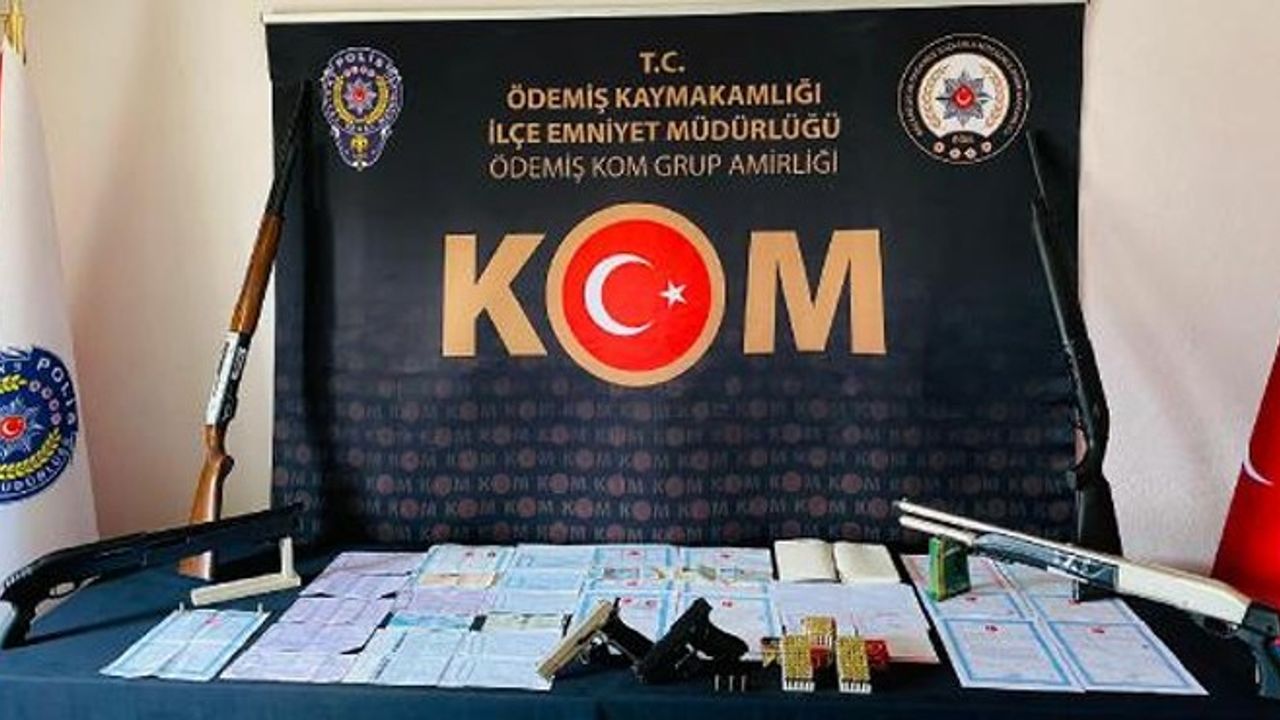 Ödemiş İlçe Emniyet Müdürlüğü'ne bağlı KOM Grup Amirliği ekipleri, ilçede tefecilik yapan kişilere yönelik dün eş zamanlı operasyonlar düzenledi. Kiraz ve Ödemiş ilçelerindeki 9 ev ve 9 iş yerine baskınlarda, 8 kişi gözaltına alındı. Şüphelilerin, acil nakit ihtiyacı içinde olan ve bankalardan kredi çekemeyenlere yüksek faizle para verip, borçları ödeyemeyenleri de tehdit ve baskı ile mağdur ettikleri belirlendi. Ev ve iş yerlerinde yapılan aramalarda; 41 senet, 10 ajanda, farklı kişilere ait 21 tapu, 6 ruhsatsız tüfek ve 20 tüfek mermisi, 2 ruhsatsız tabanca ve bunlara ait 110 fişek ve 1 pala ele geçirildi. (DHA)