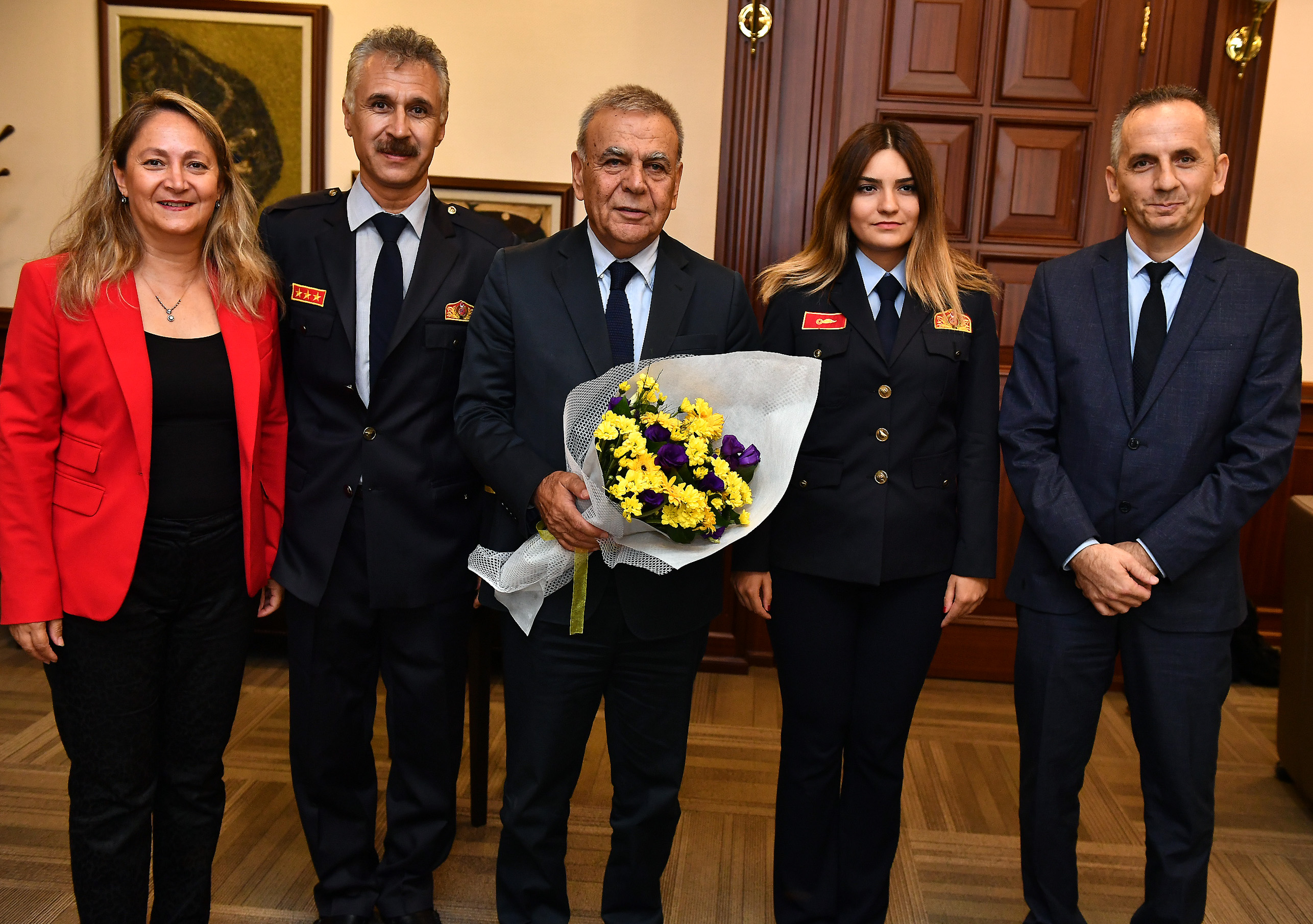 Cumhuriyet Meydanı'ndaki törenin ardından İzmir Büyükşehir Belediyesi Genel Sekreter Yardımcısı Yıldız Sezgin Devran, İtfaiye Daire Başkanı Özgür Ozan Yılmaz, İtfaiye teşkilatı yöneticileri ile İtfaiye personeli İzmir Büyükşehir Belediye Başkanı Aziz Kocaoğlu'nu ziyaret etti. İzmir Büyükşehir Belediyesi Genel Sekreter Yardımcısı Yıldız Sezgin Devran, İzmir İtfaiye Teşkilatı'nın 9 yaş ortalaması ile en genç filoya sahip İtfaiye teşkilatı olduğunu söyledi. 24 saat kesintisiz hizmet vererek İzmirliler'in canının ve malını koruyan İtfaiye teşkilatının İzmir Büyükşehir Belediyesi'nin yüz akı olduğunu söyleyen İzmir Büyük şehir Belediye Başkanı Aziz Kocaoğlu, 'İtfaiye teşkilatının başarısından dolayı gurur duyuyoruz. Özveriyle çalışıyorlar. Biz de elimizden gelen desteği vermeye çalışıyoruz' dedi.