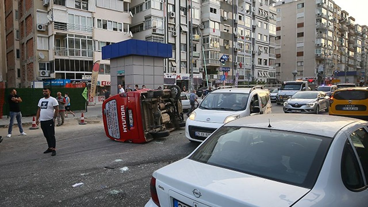 Alınan bilgiye göre, sürücüsünün ismi henüz öğrenilmeyen 35 AR 7169 plakalı panelvan, İnönü Caddesi Poligon Bölgesi'nde park halindeki araçlara çarptıktan sonra devrildi.