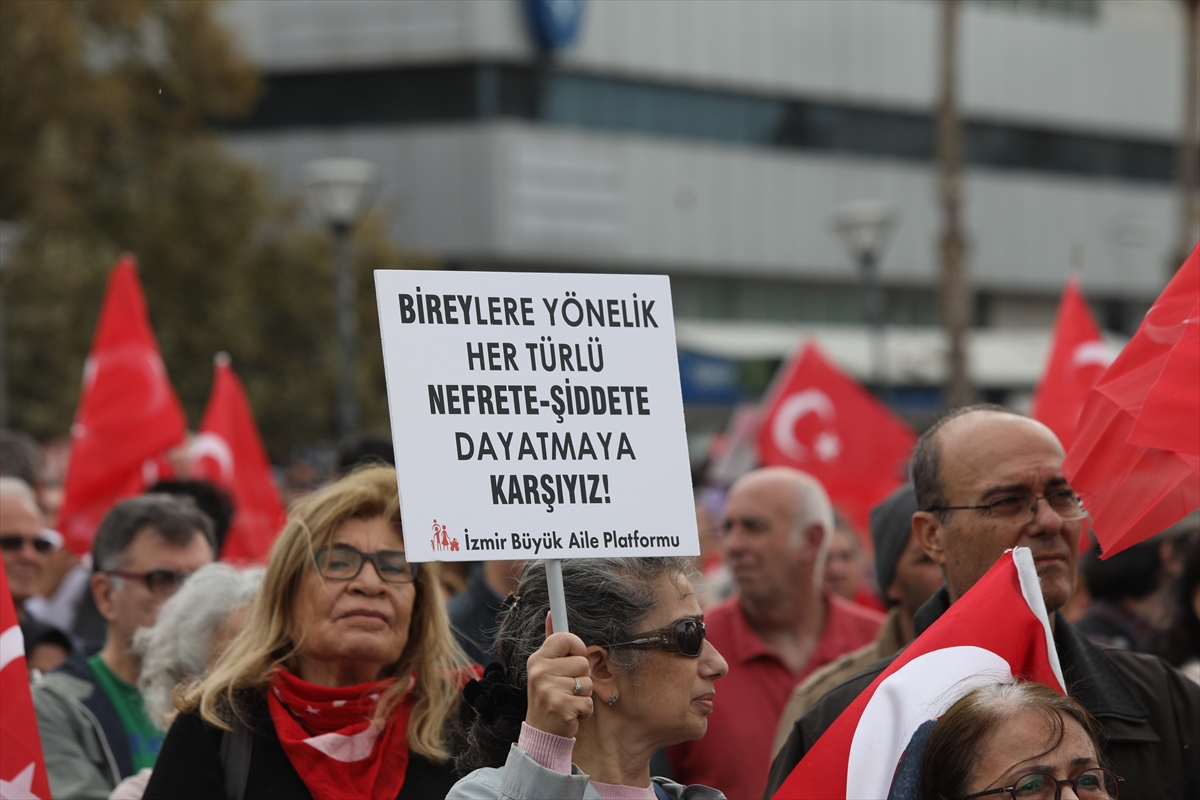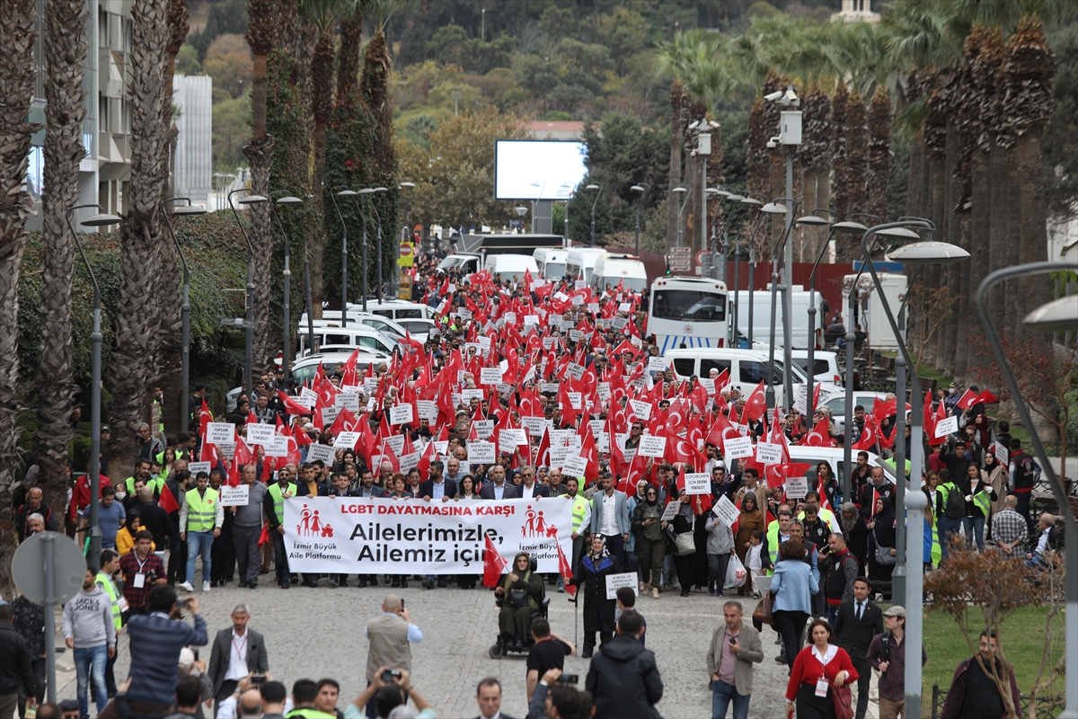 Konak Meydanı'ndaki buluşmada toplanan kalabalık, ellerinde Türk bayrakları ile 'aile medeniyetimizin temeli', 'kulak ver bu sese aile hedefte', 'aileye savaş açanlara geçit vermeyeceğiz' yazılı dövizler taşıdı.