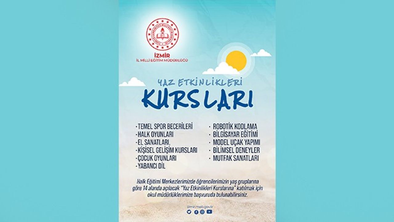 Bu kapsamda Halk Eğitimi Merkezleri aracılığı ile okullarda Temel spor becerileri, halk oyunları, el sanatları, kişisel gelişim kursları, çocuk oyunları, yabancı dil, robotik kodlama ve bilgisayar eğitimi, model uçak yapımı ve benzeri bir çok alanda kurslar açılacak. Öğrencilerin yaz tatili sürecinde daha verimli ve etkin zaman geçirebilmelerine imkan sağlayan kurslar, yaş gruplarına göre 14 alanda açılacak. Yaz Etkinlikleri Kurslarına katılmak için okul müdürlüklerine başvuruda bulunulabilir. Yaz etkinlik kurslarından bazıları şöyle; Temel Spor Becerileri, Halk Oyunları, El Sanatları, Kişisel Gelişim Kursları, Çocuk Oyunları, Yabancı Dil, Robotik Kodlama, Bilgisayar Eğitimi, Model Uçak Yapımı, Bilimsel Deneyler, Mutfak Sanatları.