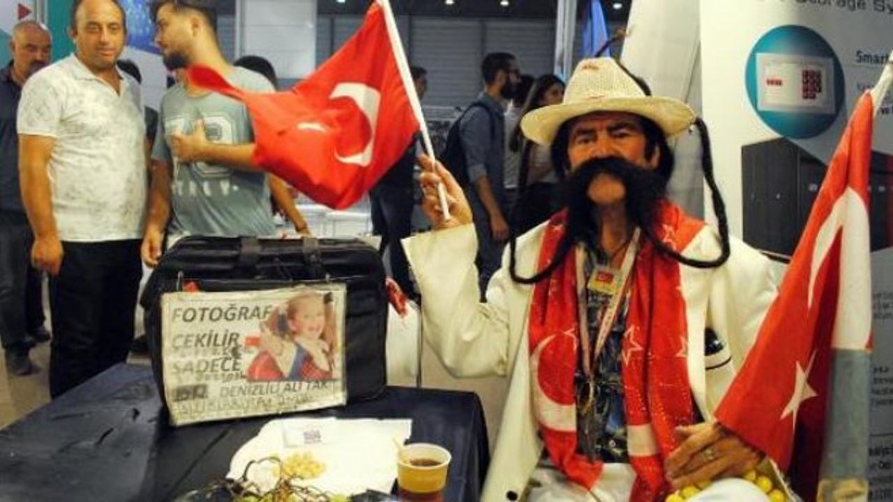 73 yaşındaki Ali Tak, İzmir Enternasyonal Fuarı'nda, 2 metre 15 santimetre uzunluğundaki bıyığıyla görenleri şaşırtıyor. Fuar ziyaretçilerinin fotoğraf çektirmek istediği Tak, bıyıkları sayesinde kazanç elde ediyor. Bıyık adam ile fotoğraf çektirmek isteyenlerin bir poz için 5 TL, 3 poz için 10 TL ödemesi gerekiyor. Türkiye genelinde düzenlenen bir bıyık festivalinde ikinci olan Tak, giydiği beyaz takım elbisesi ve yanından ayırmadığı Türk bayrakları ile fuar ziyaretçilerinden ilgi görüyor.