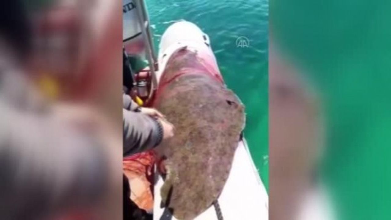 Bota alınan vatozu saran ipleri kesen ekipler, balığı denize bıraktı.(AA)