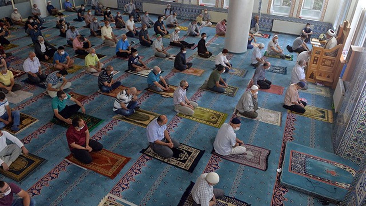 Tarihi Hisar Camisi'ne gelen çok sayıda vatandaş, maske takıp, sosyal mesafe kuralına uyarak bayram namazı için birlikte saf tuttu.