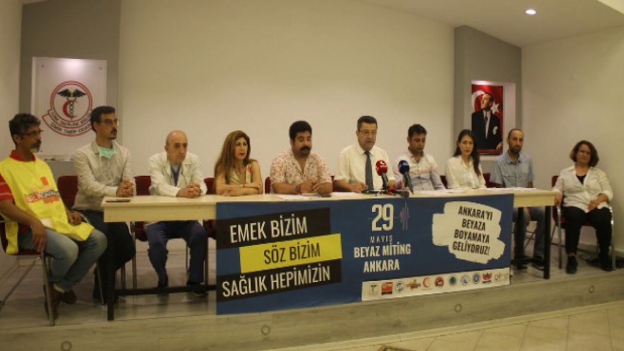 Ortak basın açıklaması İzmir Tabip Odası Başkanı Prof. Dr. Süleyman Kaynak tarafından okundu. Prof. Dr. Süleyman Kaynak, sağlık sisteminde yaşananlarında alarm verdiğini belirterek 'Kriz günbegün derinleşmektedir. Koruyucu sağlık hizmetlerini yok sayan, daha çok harcama yapılması için sağlık talebini kışkırtan ve sağlığı piyasalaştıran anlayış; hastalık üreten, toplumu yok sayan sağlık politikaları ile daha çok hastalanmış toplum ve daha çok tükenmiş hekim kitlesi yaratmıştır. Hekimlik mesleği değersizleştirildi, hekimlerin ve sağlık çalışanlarının yoksullaştırıldı. Çalışma koşulları ağırlaştı. Emeğimizin daha fazla sömürülmesi, zaten gerilemiş olan gelirlerimizin açlık sınırının da altına düşürülmesini ve emekli olduktan sonra bile gelecek endişesi ile çalışmaya devam etmek zorunda kalındığını görmekteyiz.' dedi.