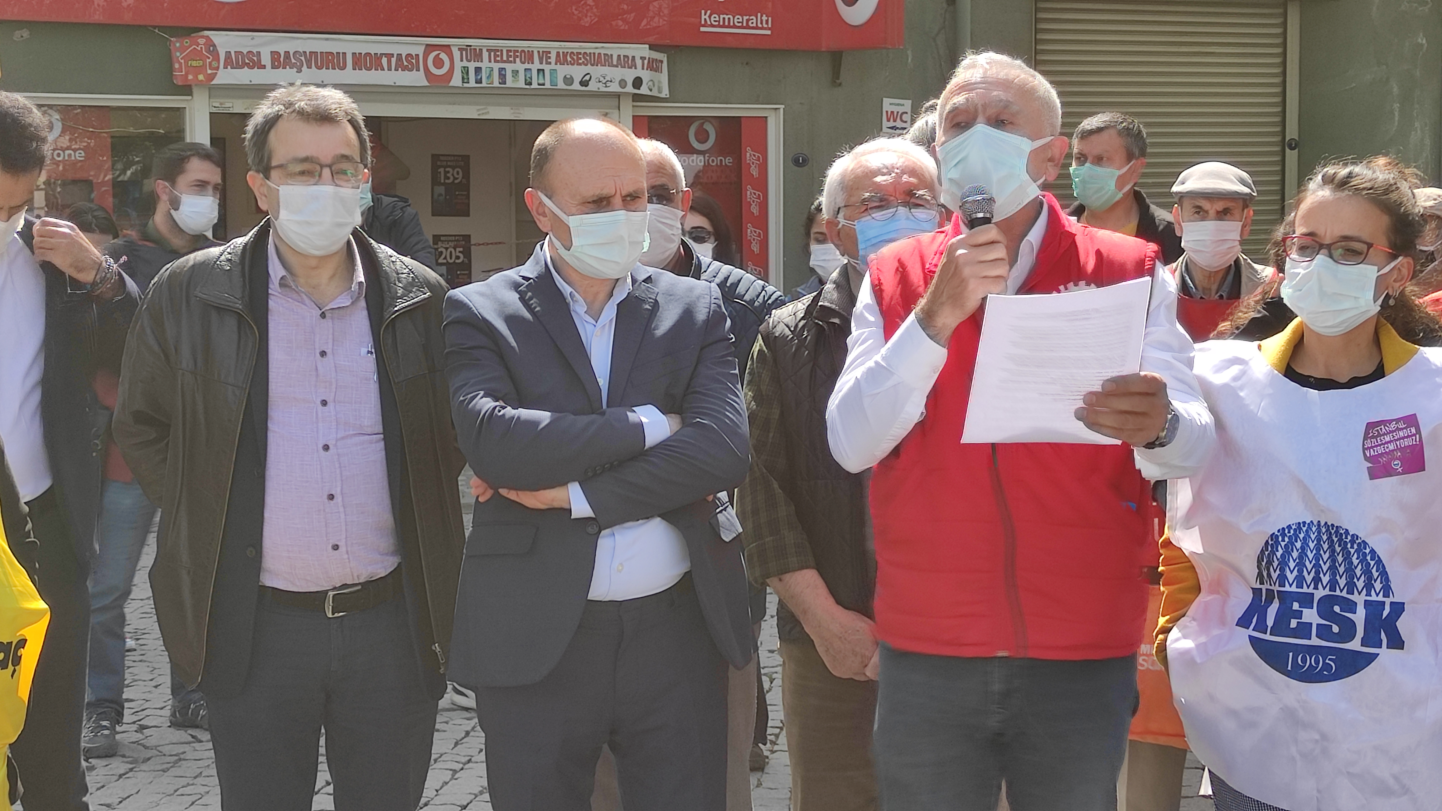 Ortak basın metnini okuyan DİSK Ege Bölge Temsilcisi Memiş Sarı, itirazlarını duyurmak amacıyla herkesi 1 Mayıs'ta sokağa çağırdıklarını duyurdu.