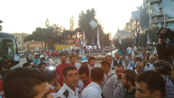 Tam bu sırada DİSK'e ait temsilciler ellerinde 'Taşerona hayır' yazılı broşürleri havaya fırlatarak Kocaoğlu'na tepki gösterdi.