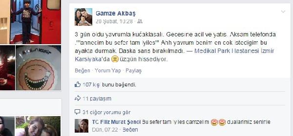 Acı haberiyle yakınlarını ve onun hayata bağlanmasıyla sevince boğulan herkesi yasa boğan Gamze Akbaş, yine geride duygu dolu mesajlar bıraktı. Gamze hastaneye yattığı zaman 20 Şubat 2015 tarihinde, facebook profilinden son mesajını paylaştı. Gamze'nin son mesajı yine oğlu Atakan'a oldu. Gamze mesajında, 'Üç gün oldu, yavrumla kucaklaşalı. Gecesine acil ve yatış. Akşam telefonda 'Annecim bu sefer tam iyileş' ahh yavrum benim en çok istediğim bu. Ayakta durmak. Başka şans bırakılmadı' sözleriyle duygusunu anlattı. Mesajın sonunda ise 'Kendisini üzgün hissediyor' notunu düştü. Gamze'nin ayrıca, kendisi gibi lösemi tedavisi gördükten sonra ilik nakliyle yaşama bağlanan 8 yaşındaki Melis Akbaş için de 4 Şubat 2015 tarihinde, 'Kelebekler kadar renkli. Ama onlar kadar kısa olmasın ömrümüz güzel kızım Melis. Kanserle mücadele için verdiğimiz röportaj. Sağlık dolu günlerde mutlu olmayı da hakketik' yazdı.