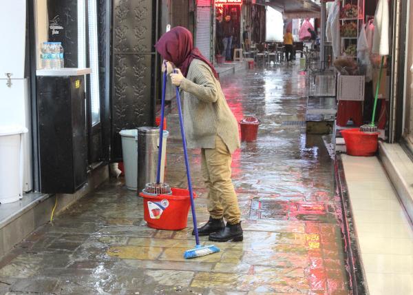 İzmir'de dün gece başlayan ve bu sabah artarak devam eden yoğun yağış nedeniyle, bazı bölgelerde su birikintileri oluştu. Tarihi Kemeraltı Çarşısı'ndaki sokaklarda da yoğun birikintiler olurken, esnaf önlemler aldı. İş yerlerinin önüne kovalar koyup, suları süpüren esnaf, iş yerinin içine su girmesi ihtimaline karşı hazırlıklarını yaptı. Çarşıda bulunan Küçük Demirhan, en çok su alan yerlerden biri oldu. Hanın girişi suyla dolunca müşteriler içeri giremedi. Handa bulunan iş yerleri ve lokantalarda çalışanlar, yağmur çizmeleri giyerek, suları dışarı çıkardı. İş yerlerinin içine kadar giren yağmur suları, esnafın ürünlerini ıslattı. Çarşı esnafından Veysi Bolcal, 'Çok yağmur yağdığı zaman 15- 20 dakika içerisinde çarşının belirli bölgelerini genellikle su basar. Deniz seviyesine sıfır olduğu için basıyor. Altyapı olmadığı için belediye de bir şey yapamıyor. Büyük bir çalışmayla alttan kanallar yapması gerekiyor. Esnaf bir ay dükkan kapatacak ki olacak, o da çok zor. Bunu çekeceğiz herhalde. Yoğun yağış oldu mu iş yapamıyoruz, bütün banklarımızı içeri topluyoruz. Kovaları su boşa gitmesin diye koyuyoruz, sonra yerleri yıkıyoruz. Dükkanların içine yarım metreye kadar su giriyor. Şalterleri indiriyoruz sıkıntı olmasın diye. Bugünkü yağışla öğleden sonra bir sel baskını olur' dedi.