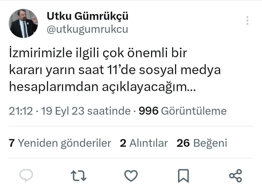 Başkan Gümrükçü, merak uyandıran paylaşımında, 'İzmirimizle ilgili çok önemli bir kararı yarın saat 11'de sosyal medya hesaplarımdan açıklayacağım…' ifadelerini kullandı.