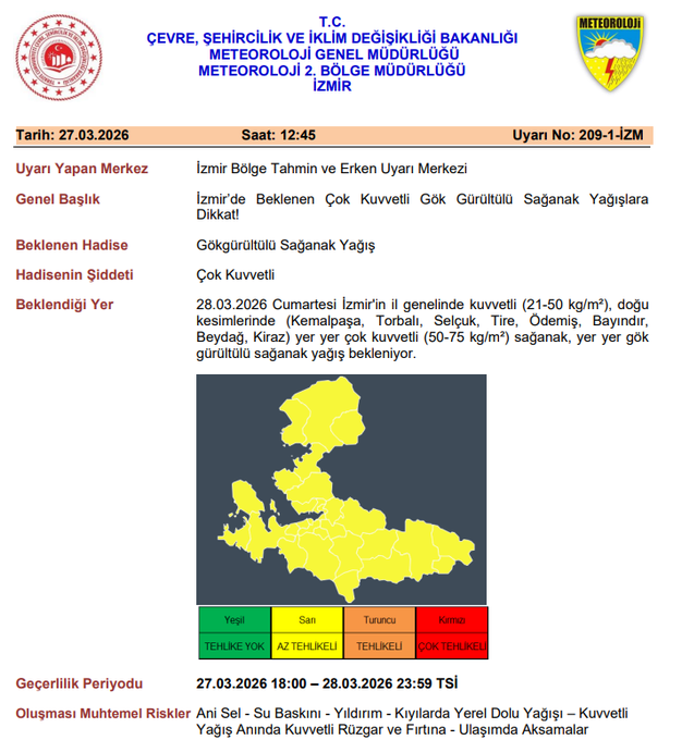 EGEDESONSÖZ - Meteoroloji yetkilileri, İzmir genelinde gök gürültülü sağanak yağış beklendiğini belirterek “sarı” kodlu uyarı yayımladı.