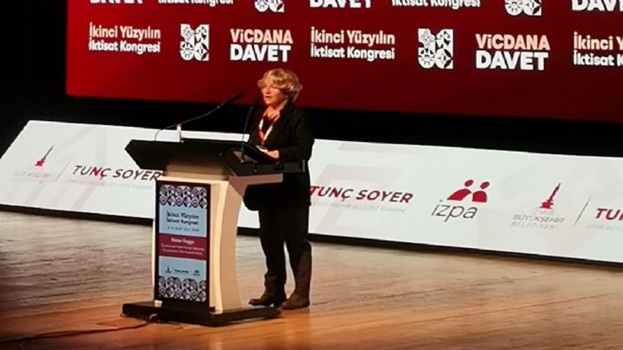 İzmir İktisat Kongresi'nin ikinci gününde, 'Vicdana Davet' sloganıyla gerçekleştirilen programda konuşmacı olarak CHP Yoksulluk Dayanışma Ofisi Koordinatörü Hacer Foggo katıldı.