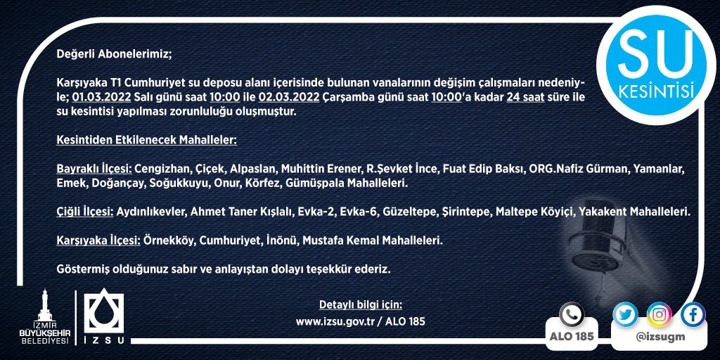 Çalışmalar kapsamında Karşıyaka ilçesinde gerçekleştirilecek olan vana değişim işlemi sebebiyle 3 ilçede 26 mahalleye 24 saat süreyle su verilemeyecek.