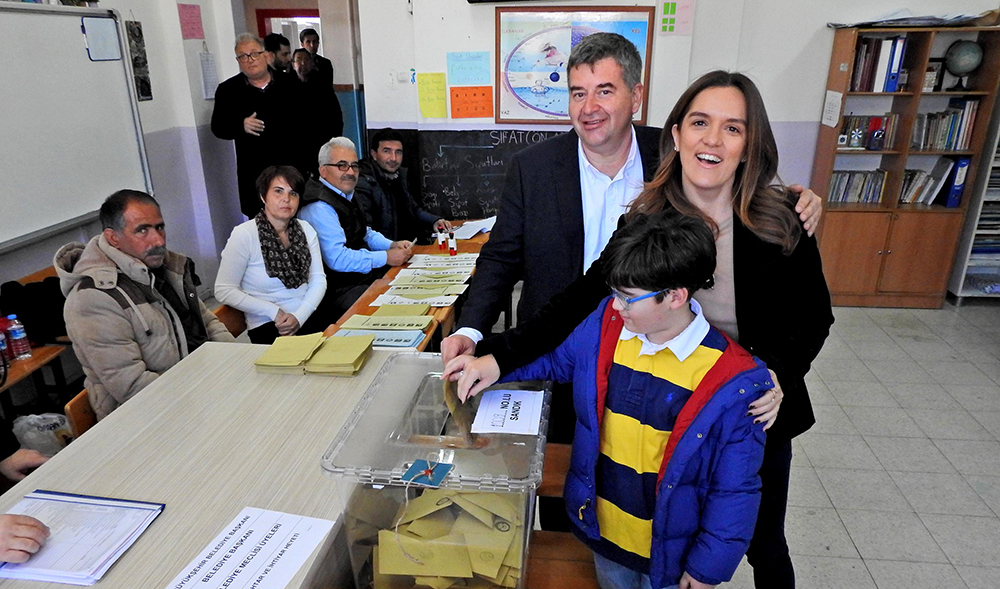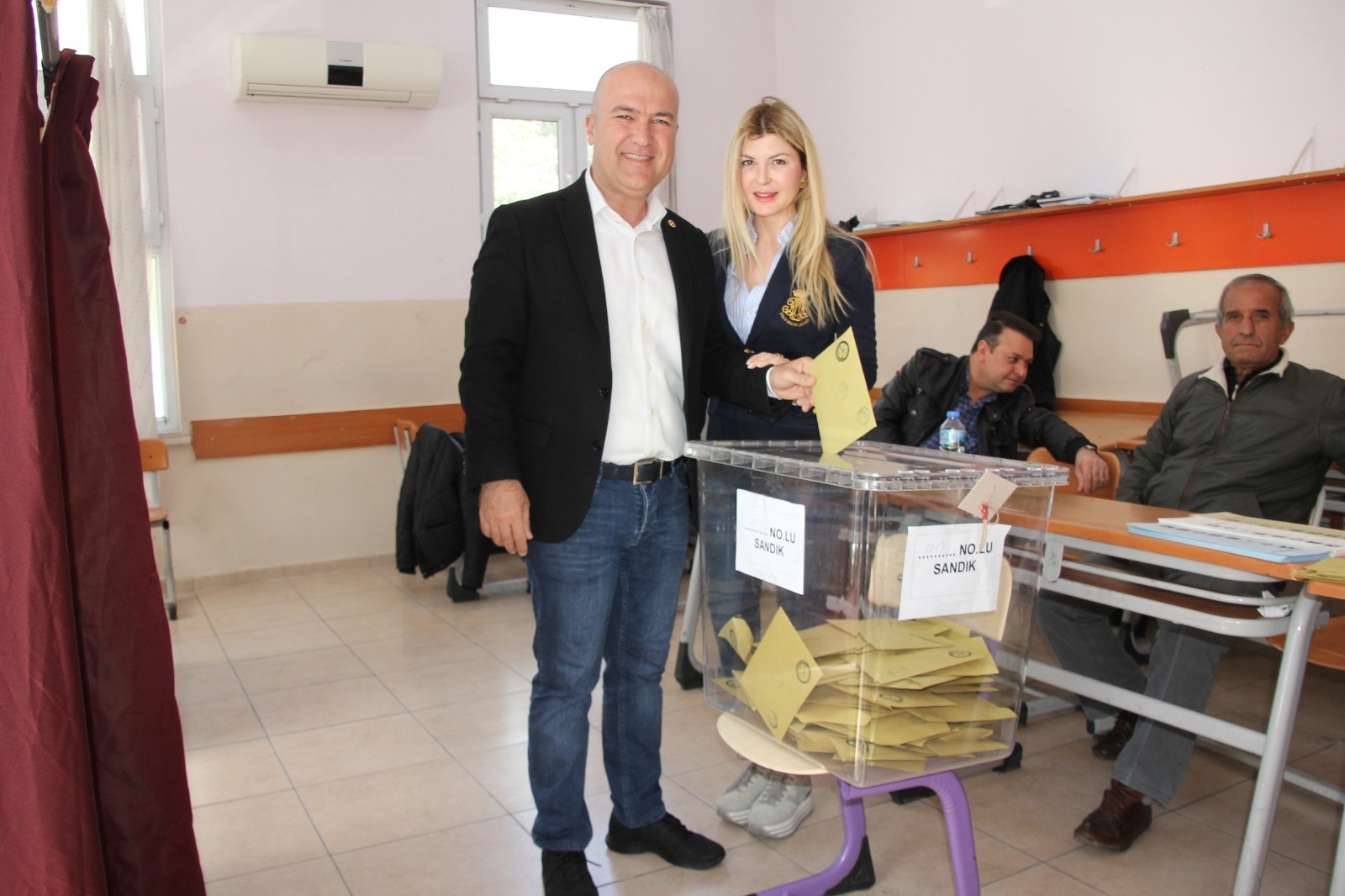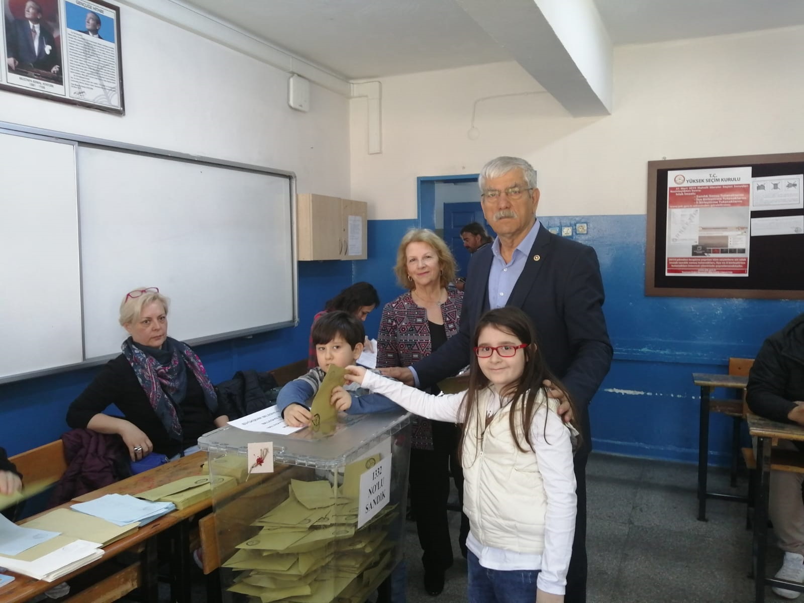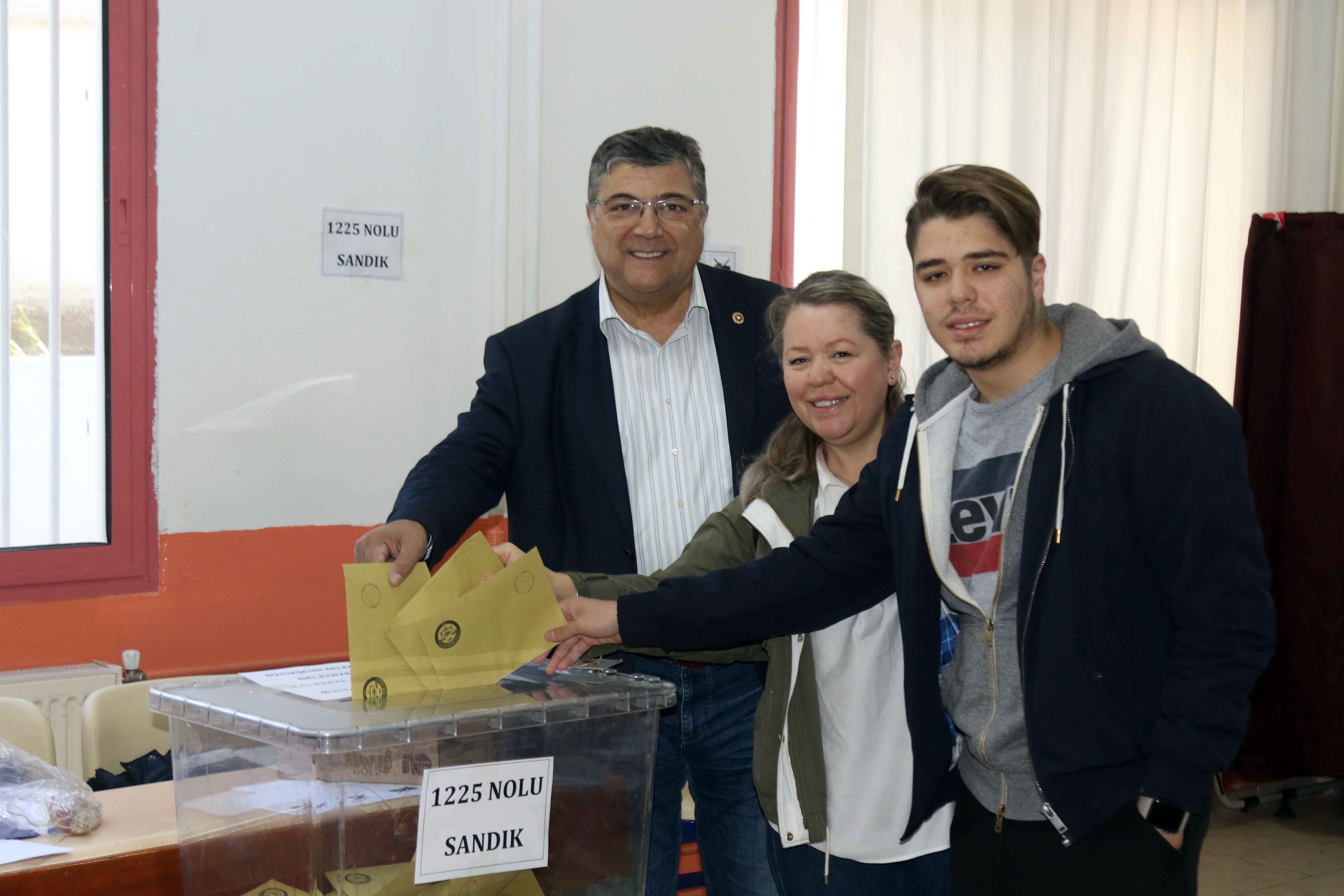 CHP'nin İzmir Büyükşehir Belediye Başkan Adayı Tunç Soyer, eşi Neptün Soyer ve kızı Duygu Soyer ile oyunu kullanmak için Sığacık 80.Yıl Cumhuriyet Ortaokulu'na geldi.