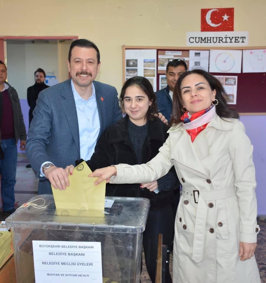 AK Parti İzmir Milletvekili Mahmut Atilla Kaya, eşi Pınar Çağlar Kaya ve kızı Beyza ile oyunu Torbalı Ticaret Odası 80. Yıl İlk ve Orta Öğretim Okulu'nda kullandı. Kaya, 'Güzel İzmir'imiz ve ülkemiz için hayırlı uğurlu olmasını diliyorum' dedi.