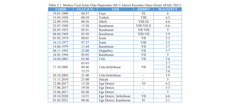 Raporda İzmir'de 5.0 ile 7.0 büyüklüğü arasında değişen ve yıkıcı deprem üretebilecek çok sayıda fayın olması, geçmişte can ve mal kaybına neden olan yıkıcı depremlerin yaşanmasının kentteki en önemli tehlikenin deprem olduğunu ortaya koyduğu ifade edildi.
