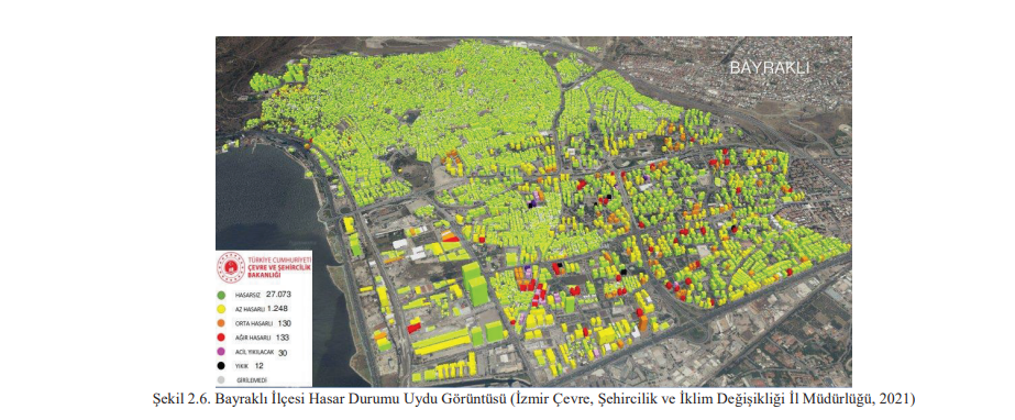 Raporda 30 Ekim 2021'deki Samos Depremi sonrasında 27 ilçedeki 752 yıkık/ağır hasarlı konut tespit edildiğinin bilgisi verilirken '7269 sayılı Umumi Hayata Müessir Afetler Dolayısıyla Alınacak Tedbirlerle Yapılacak Yardımlara Dair Kanun kapsamında, 40 adet binanın acil yıkım kararı alınmış ve yıkımları gerçekleştirilmiştir. Ayrıca 6306 sayılı Kanunun 6A maddesi kapsamında, riskli yapı tespiti yapılan 31 adet binanın yıkımları gerçekleştirilmiştir.' denildi.