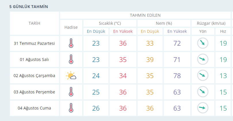 Hafta boyunca en fazla 36°C'nin olacağı beklenirken, geçtiğimiz hafta yaşanan rekor sıcaklıkların uzun bir süre bir daha kırılmayacağı tahmin ediliyor. Nem oranının yüzde 78'leri bulacağı haftada, nemden dolayı bunaltıcı bir hava bekleniyor.