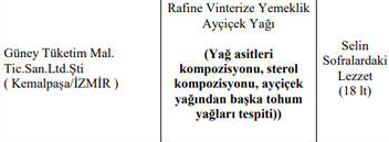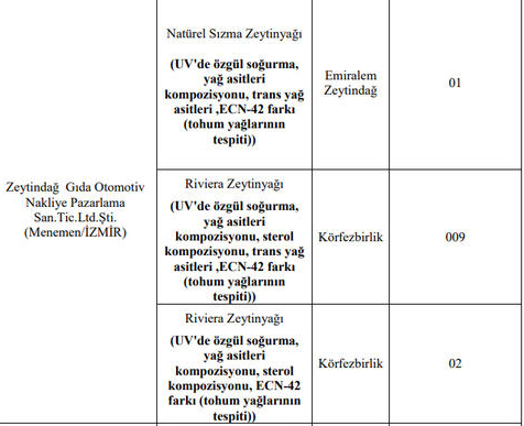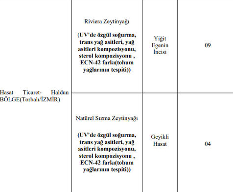Zeytinyağı ilen bilinen ve Ege Bölgesi'nin illeri arasında zeytinyağları ile marka olarak öne çıkan İzmir'de zeytinyağında da bitkisel yağ bulunan firma tespit edildi. Torbalı'da bulunan Hasat Ticaret 'natürel zeytinyağında bitkisel yağ tespit edilirken hileli ürünlerden bir diğeri ise Aliağa'da bulunan Ege NKM Gıda Sanayi ve Ticaret A.Ş. ile Çeşme Süt ve Tarım Ürünleri Sanayi Ticaret Pazarlama Ltd. Şti. firması oldu. Tereyağında da aynı şekilde hile yapıldığı tespit edilirken bu yönteme başvuran firma ise tereyağı markası ile bilinen Selçuk'ta üretim yapan Çeşme Süt ve Tarım Ür. San.Tic ve Pazarlam Ltd. Şti. oldu.
