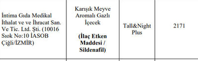 Hileli ürünler listesinde yayınlanan içecek üreten ve Çiğli'de bulunan Karışık Aramolı Gazlı İçecek üreten İntima Gıda Medikal İthlat ve İhracat San. Ve Tic. Ldt. Şti.'nin ürünlerinde 'Sildenafil' katkı maddesi kullandığı tespit edildi. Söz konusu kimyasal katkı maddesi sildenafil aynı zamanda cinsel performans artıcı ürün olarak bilinen viagra maddesinde kullanılması dikkat çekti. Bir başka firma ise Bornova'da bulunan Bornova'da bulunan Ömer Osaman Korkmaz'a ait Lokman Hekim 'Üzümlü İçecekler' firması oldu. Firma üzümlü içeceklerde knidin kimyasal katkı maddesi kullandığı tespit edildi.
