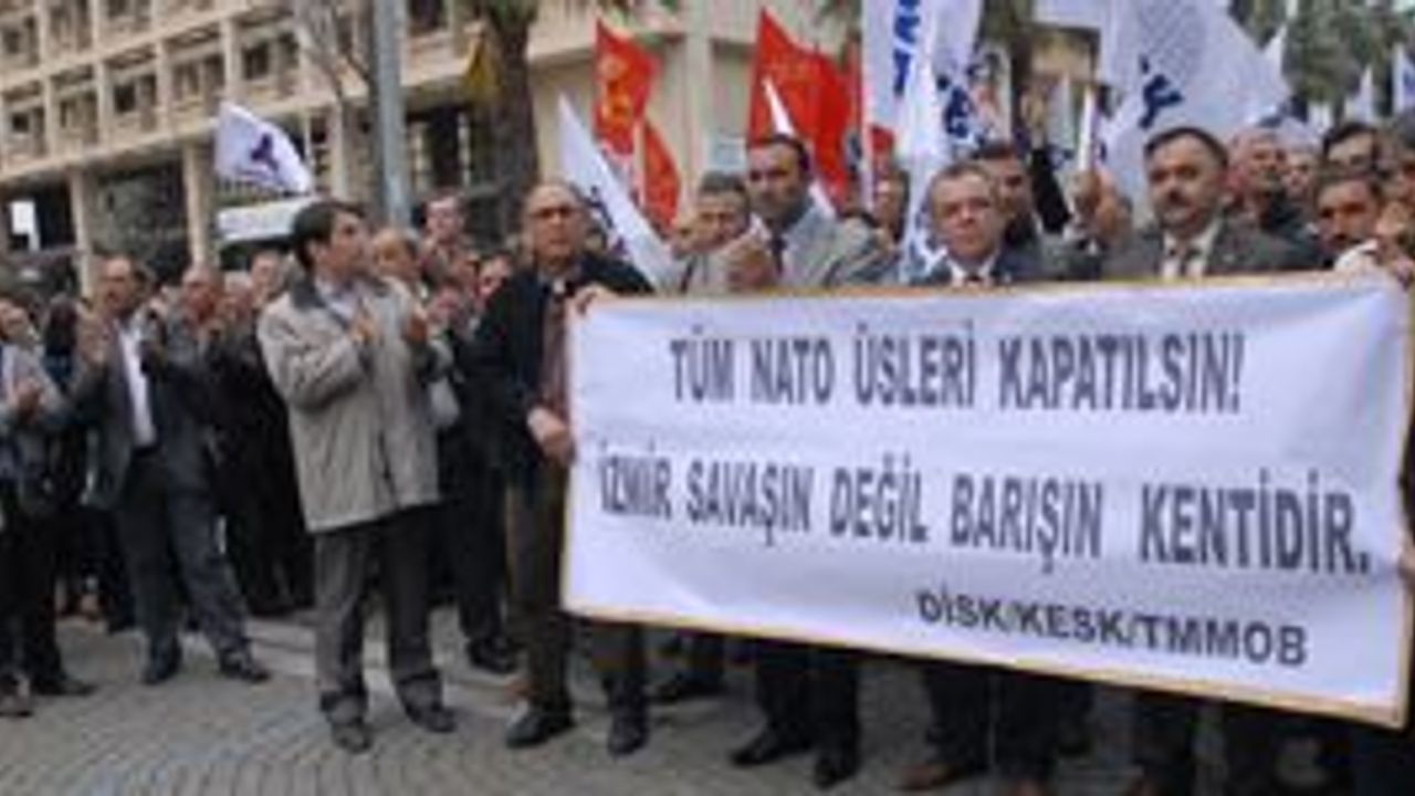 İZMİR - Konak Meydanı'ndaki eski Sümerbank Binası önünde toplanan TMMOB üyeleri ile destek veren ÖDP, KESK, DİSK ve bazı sivil toplum kuruluşlarının üyeleri, ''NATO üsleri kapatılsın, İzmir savaşın değil barışın merkezi olsun'' yazılı pankart ve Libya'ya yönelik operasyonu eleştiren dövizler açtı. ''Silahlar sussun, üsler kapatılsın'', ''Kahrolsun ABD emperyalizmi'', ''Libya halkı yalnız değildir'' şeklinde slogan atan grup, İzmir Büyükşehir Belediye Sarayı önüne yürüdü.