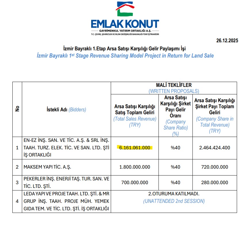 EGEDESONSÖZ - Çevre, Şehircilik ve İklim Değişikliği Bakanlığı'nın şirketi Emlak Konut Gayrimenkul Yatırım Ortaklığı, İzmir'in Bayraklı ilçesindeki 2 taşınmaz için arsa satışı karşılığı gelir paylaşımı ihalesi düzenledi.