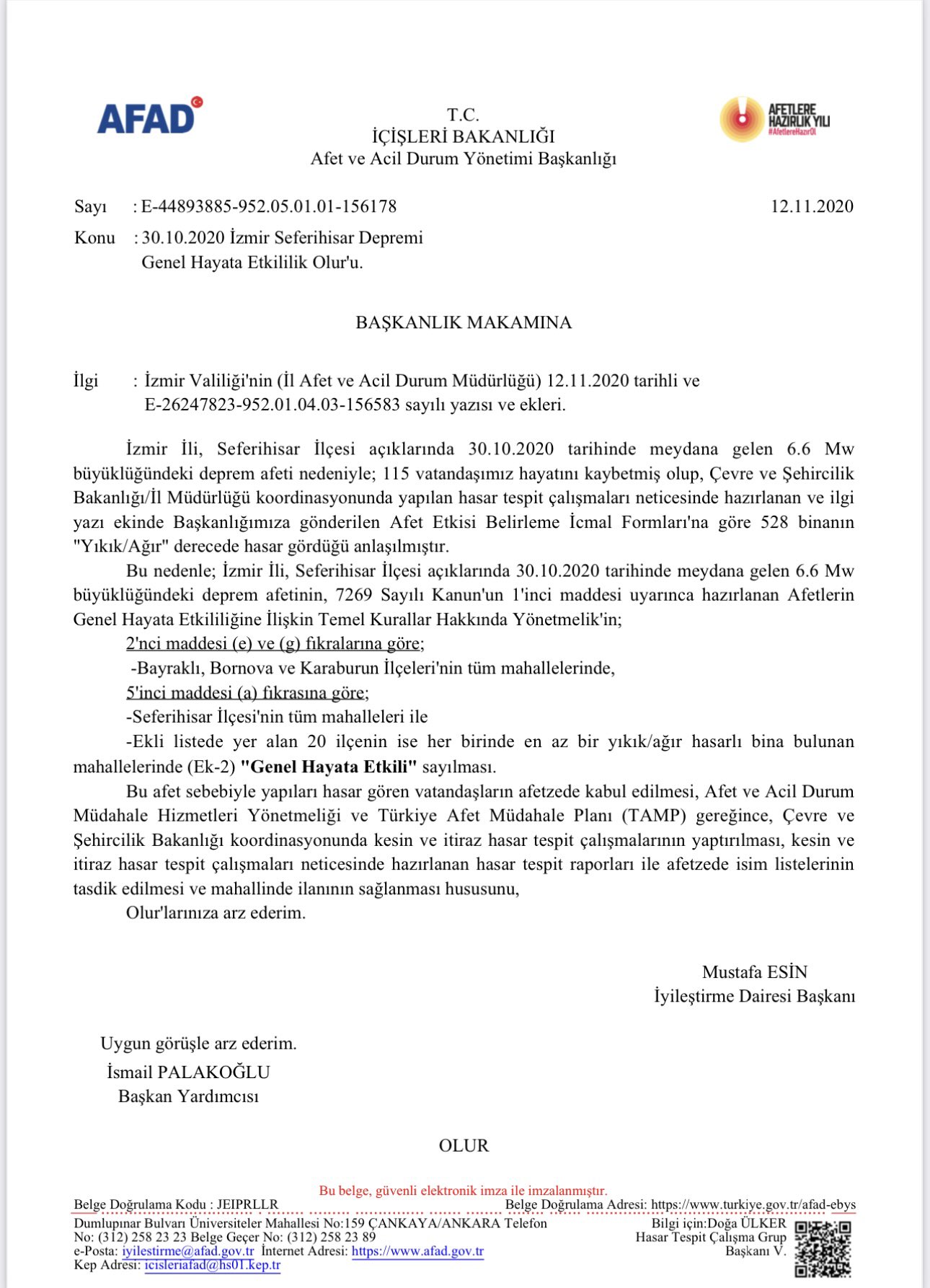 Sertel'in açıklamasına AK Parti İzmir Milletvekili Mahmut Atilla Kaya'dan yanıt geldi. Kaya yaptığı açıklamada AFAD tarafından yayımlanan bildirgeyi paylaşarak '12.11.2020 tarih 156178 sayı ve devamında alınan dört kararla, 30 Ekim 2020 İzmir depreminin genel hayata etkili afet olduğuna dair karar verilmiştir. Şahsınız ve partiniz yalanı alışkanlık haline getirmiştir. Bir afet üzerinden yaptığınız çirkin siyaseti kınıyorum. Ayıp!' dedi.