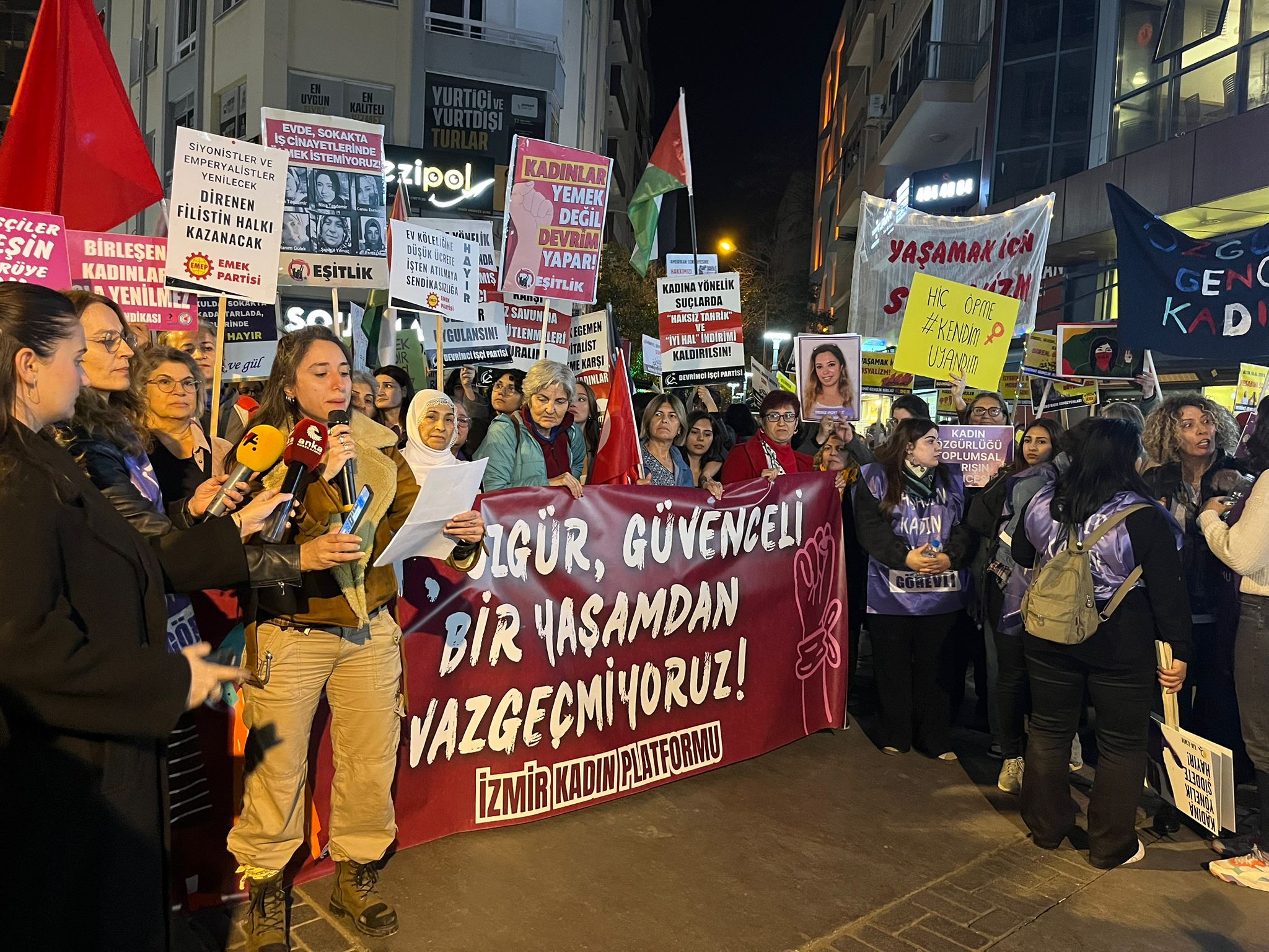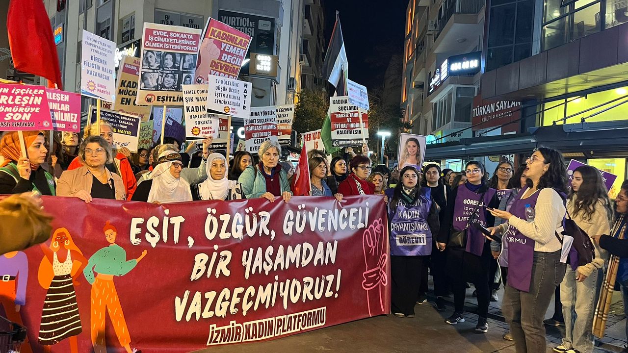 Berivan KAYA-Dilek ÇELİKTEN/EGEDESONSÖZ- 25 Kasım Kadına Yönelik Uluslararası Mücadele Günü’nde İzmirli kadınlar sokaklara çıktı. Alsancak Kıbrıs Şehitleri’nde toplanan kadın örgütleri Türkan Saylan Kültür Merkezi önüne yürüdü. Yürüyüşe DEM Parti İzmir Milletvekili Burcugül Çubuk, kadın örgütleri ve çok sayıda kadın katılım sağladı.