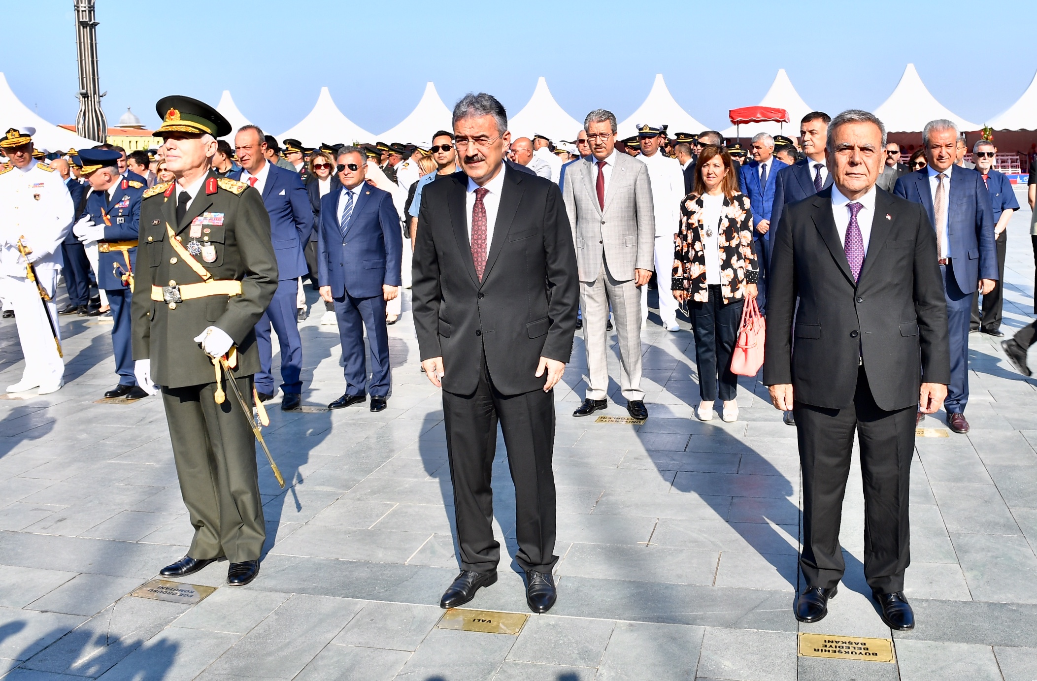 Meydanda gerçekleşen ilk törende, İzmir Valisi Erol Ayyıldız, Ege Ordusu ve Garnizon Komutanı Orgeneral Abdullah Recep ile İzmir Büyükşehir Belediye Başkanı Aziz Kocaoğlu Atatürk anıtına çelenk koydu. Buradaki törenin sona ermesinin ardından İzmir Valiliği'ne geçildi. Vali Ayyıldız, Ege Ordusu ve Garnizon Komutanı Orgeneral Recep ve Büyükşehir Belediye Başkanı Kocaoğlu, valilikte tebrikleri kabul etti.