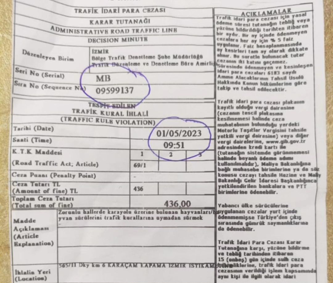 Bornova Karaçam mevkiinde karayolunda at süren bir şahıs trafik cezası yedi. 'Zorunlu hallerde karayolu üzerine bulunan hayvan sürülerini trafik kurallarına uymadan sürmek' maddesinden 436 TL ceza yiyen şahsın yediği cezanın tutanağı sosyal medyada gündem oldu.