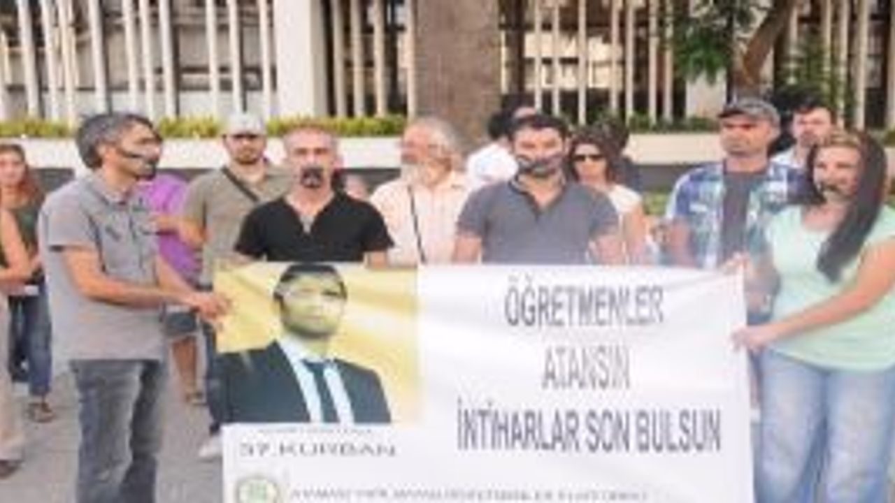 İZMİR - Atanamayan öğretmenler İzmir'de 'duran öğretmen' eylemi gerçekleştirdi. İzmir Büyükşehir Belediyesi önünde toplanan 4 öğretmen ağızlarını bantladı. Daha sonra ise üzerinde intihar eden atanamayan öğretmen Mehmet Sadık Güneş'in fotoğrafının yeraldığı 'Öğretmenler Atansın İntiharlar Son Bulsun' yazılı pankartı tutarak iki saatlik durma eylemi yaptı. Gruba daha sonra 6 atanamayan öğretmen daha katıldı.