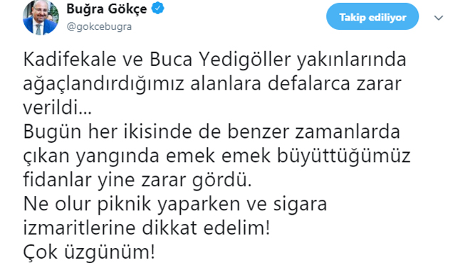 İzmir Büyükşehir Belediyesi Genel Sekreteri Buğra Gökçe sosyal medya hesabından kentteki iki yangına dair bilgiler verdi. Genel Sekreter Gökçe ayrıca bu noktada vatandaşları duyarlı davranmaya çağırdı. Gökçe, 'Kadifekale ve Buca Yedigöller yakınlarında ağaçlandırdığımız alanlara defalarca zarar verildi... Bugün her ikisinde de benzer zamanlarda çıkan yangında emek emek büyüttüğümüz fidanlar yine zarar gördü. Ne olur piknik yaparken ve sigara izmaritlerine dikkat edelim! Çok üzgünüm!' açıklamasını yaptı.